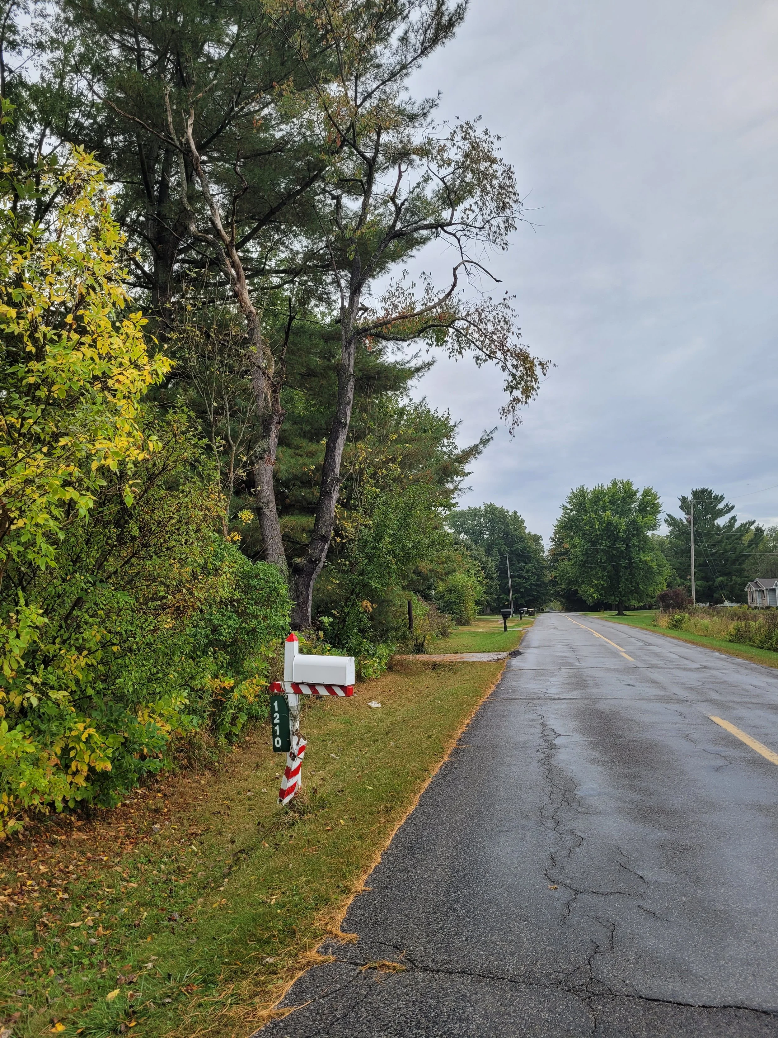 Look for the red and white striped mailbox post on the east side of Edgar Rd.